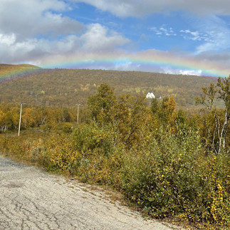 With renewed vigor, I embarked on another day’s trek across Haukskardmyrin (marsh), traversing a marshland adorned with peculiar “palsas.” These permafrost formations, with their icy cores, created ephemeral ponds and muddy wetlands to navigate on warmer days. Crossing a lengthy wooden bridge over a meandering river, I reached the base of Hjerkinnhø ⛰️ , where the modern marvel of “Eysteinkyrkja” church lay beneath a gentle mist that had painted a rainbow, a poetic interlude in my pilgrimage.